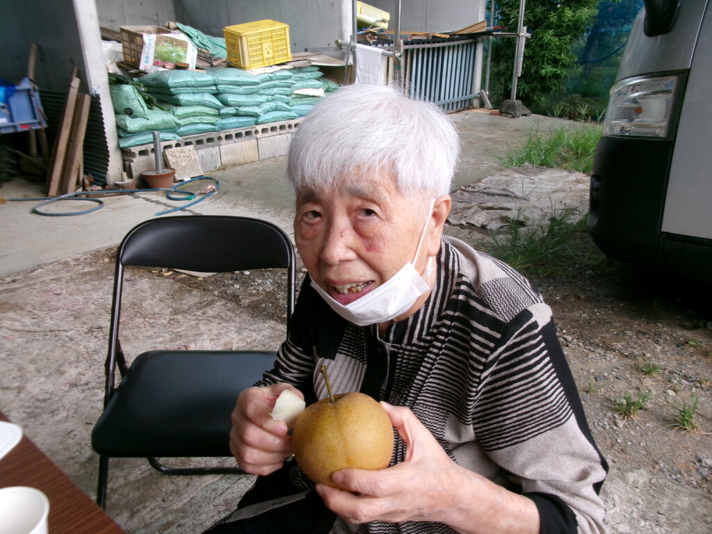 鈴なりになっている梨の木の下で一番甘そうなのを狙って皆様の顔は真剣です(^_-)-☆