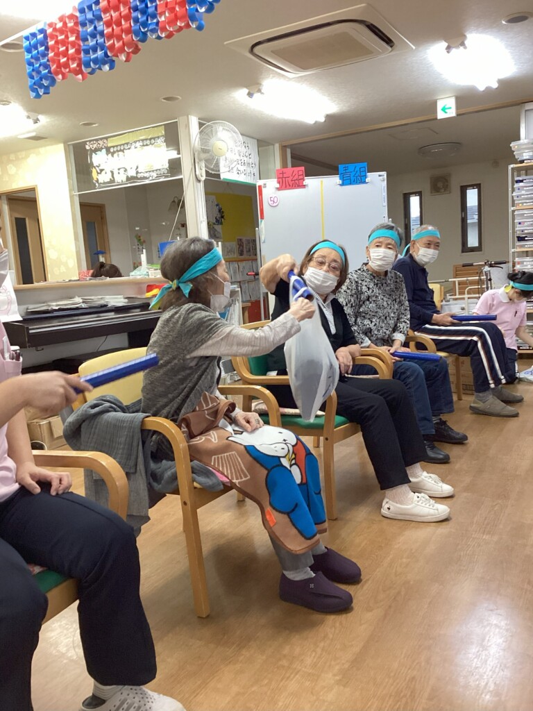 紅組と青組に分かれ、ハチマキを付けて皆様気合い十分!!