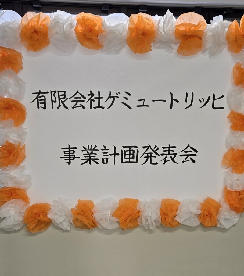 去る令和7年11月21日(金)18:30~当社として初の試みとして令和8年事業計画発表会を開催致しました。~beyond the future at gemutlich~これまでも、そして、これからも・・・職員の皆さんと共に・・・未来に歩んでいきたいです♡社長の想いと共に当社の経営方針や考え方、各種DATA等を共有し、職員と「心合わせ」して、共に未来に向かって一致結束して、我々のサービスを通じてより地域社会のお役に立ち続けることを目的としたものです。発表会に先立ち、社長自らコーヒー・紅茶等の飲み物や美味しいクッキーの準備を「お・も・て・な・し」の心で職員の皆さんをお出迎えされました。発表会は社長挨拶から始まり、事業計画発表、昨年から本年の総括、質疑応答、そして、通所介護(デイサービス)さくら草/施設長補佐のR・Iさんの「ゲミュ-トリッヒ締め~心合わせ~」で職員一同「心合わせ」をし、最後は閉会の言葉で閉会となりました。暫しの歓談後、最後に社長からの各職員へメッセージカードの贈呈があり、散会となりました。今回は、初の試みという事もあり、試行錯誤しながらではありましたが、事前準備に通所介護(デイサービス)さくら/施設長のS・Kさんのお力もお借り致しました。その他、習字にて通所介護(デイサービス)さくら草/生活相談員のH・Iさんに大変立派にお書き頂き、同じく介護職員のH・Yさんに写真撮影にご協力頂きました。~ありがとうございました。~当社は来る令和7年12月3日に新しい組織体制へ変わります。ますます、皆様のご期待にお応えしていく為に、職員一同、満足を超えた感動サービスをご提供できるよう、日々精進して参りたいと思います。今後のgemutlichの介護サービスにご期待下さい。