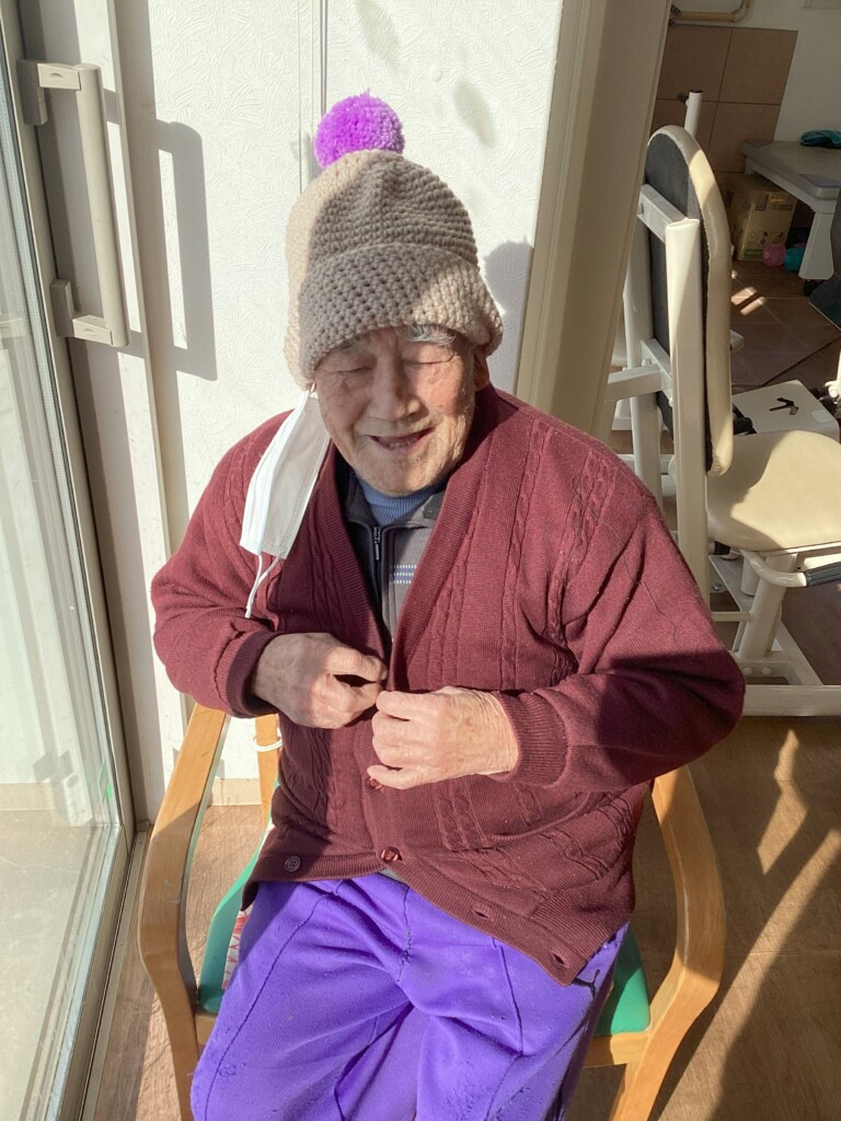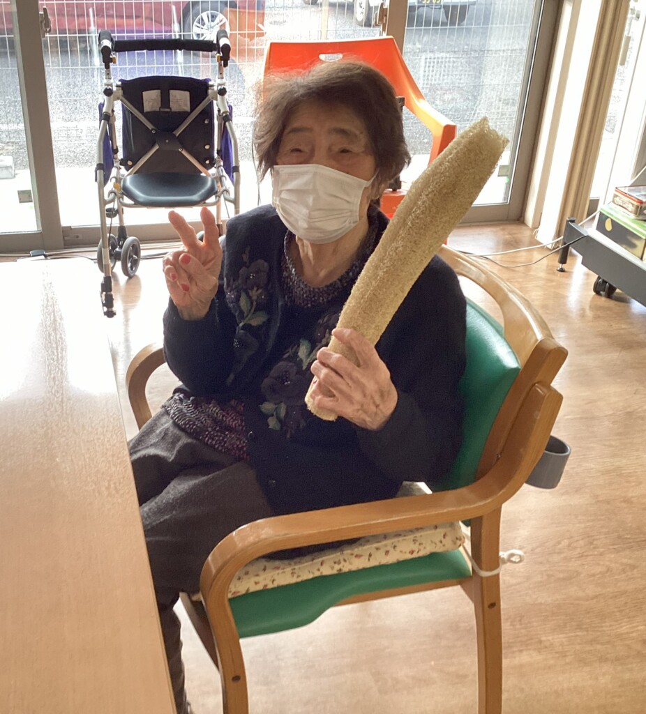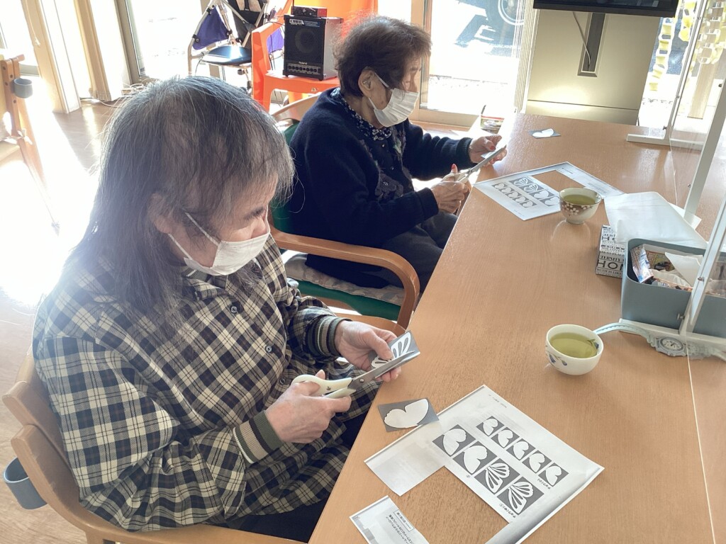 娘様からの手作りの帽子、糸瓜の出来上がり、春に向けての折り紙、はさみでチョキチョキ、お花畑の制作真っただ中🌸