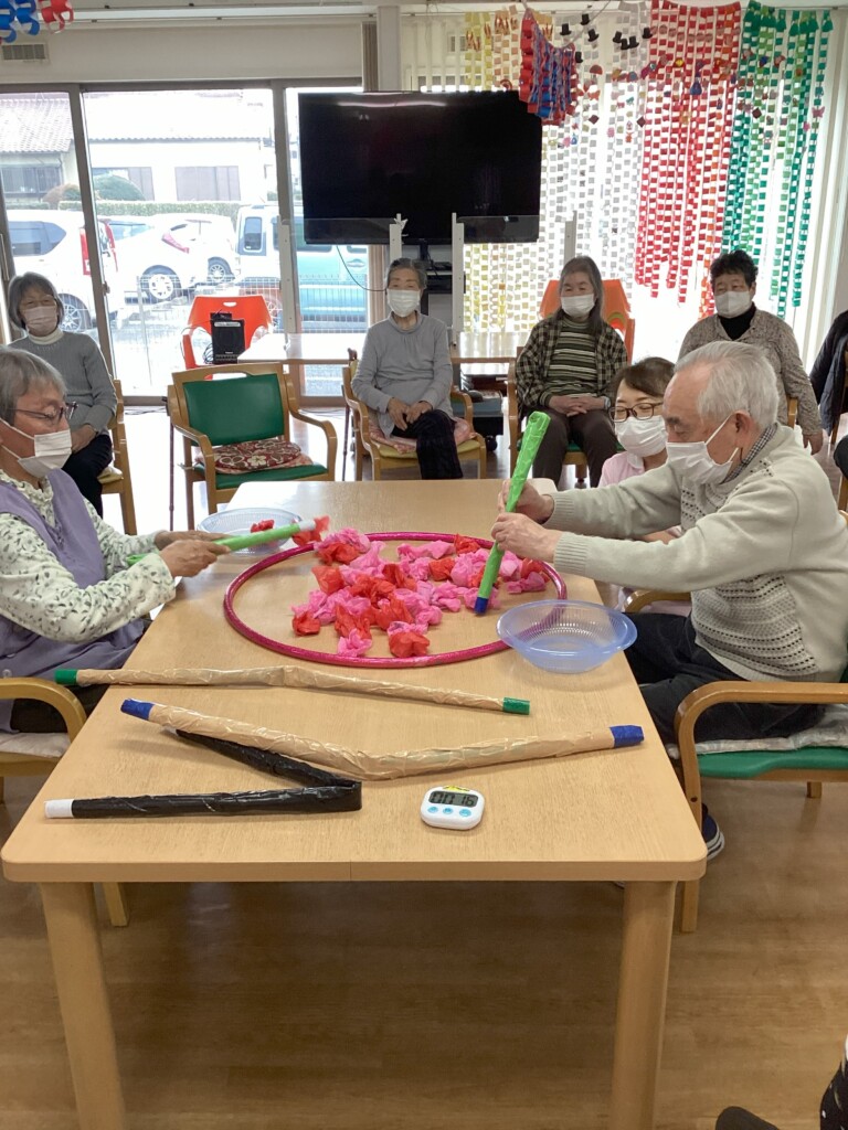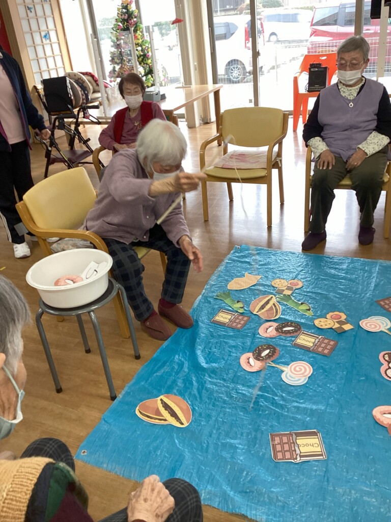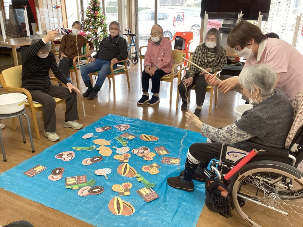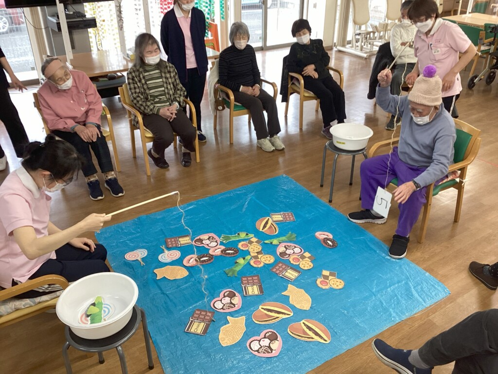 2月のゲームは甘い物釣り、ハートつかみとお菓子づくし🍫。手を使ったり、計算したり・・・。たくさんゲットしても勝てないかもしれません。💦