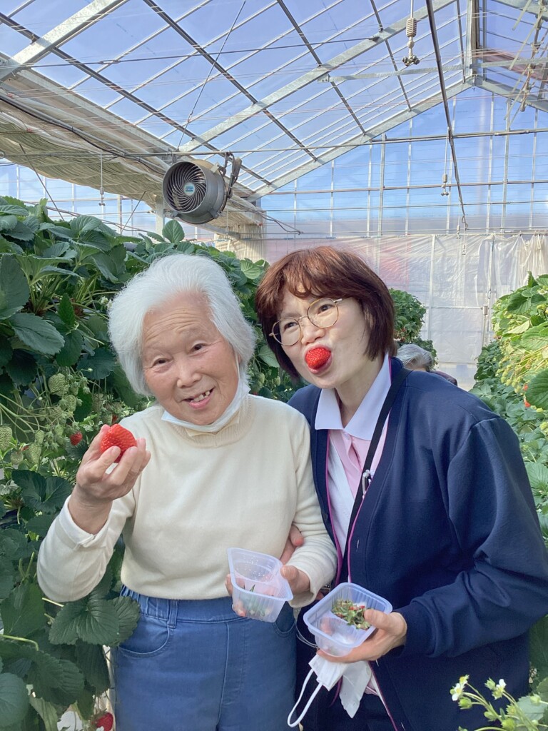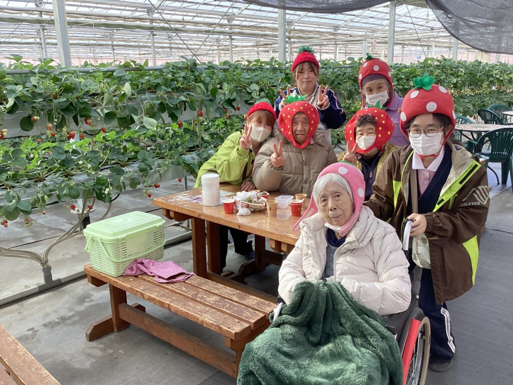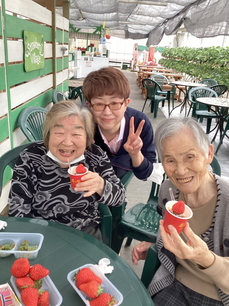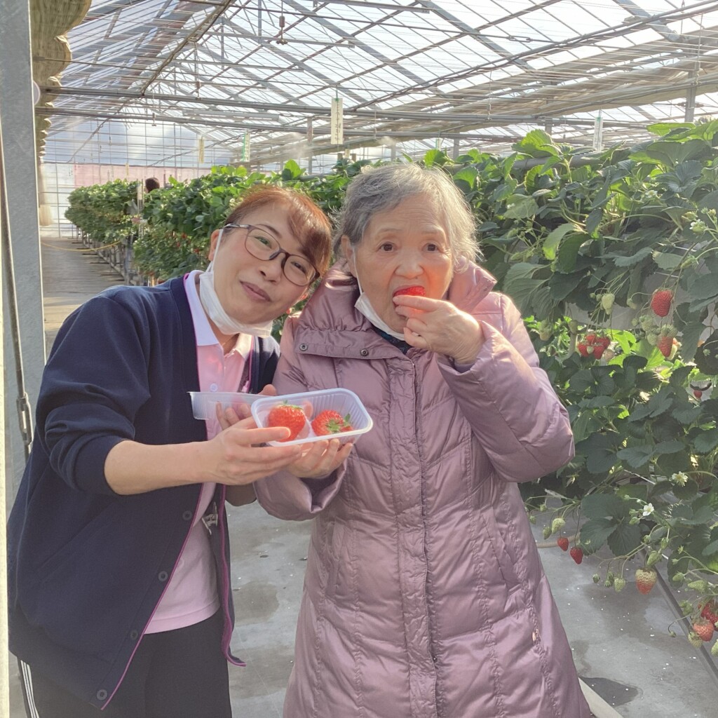旬のいちごを心ゆくまで堪能してきました🍓いびつな形のいちごの方が甘いそうですよ。ご利用者様と職員の美味しい笑顔ご覧ください。