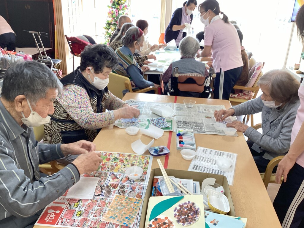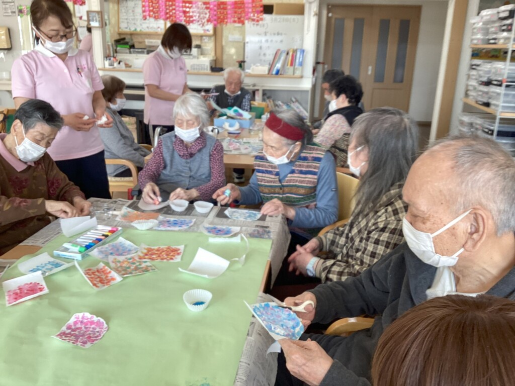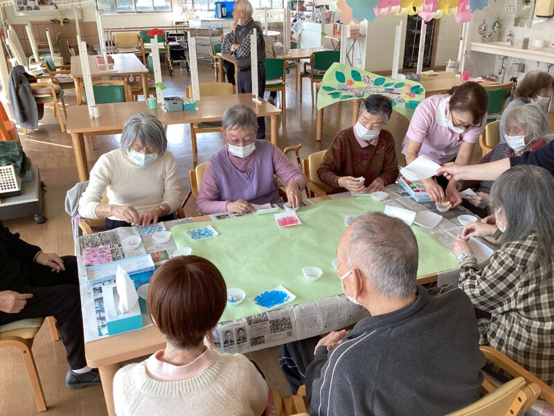 スポンジに絵具を付けてポンポンあじさい作り、今回は大型作品です。